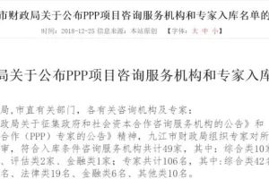 图片来源:九江市财政局官网近日,江西省九江市财政局公布《关于公布PPP项目咨询服务机构和专家入库名单的通知》,符合入库条件咨询服务机构共计49家;专家共计106名。其中,睿立方咨询成功入选咨询服务机构,睿立方咨询总经理许宏宇、睿立方咨询副总经理王艳入选专家库。以下是《通知》全文:九江市财政局关于公布PPP项目咨询服务机构和专家入库名单的通知各县(市、区)财政局,市直有关部门,各有关咨询机构及专家: 根据《九江市财政局关于征集政府和社会资本合作咨询服务机构的公告》和《九江市财政局关于征集政府和社会资本合作(P